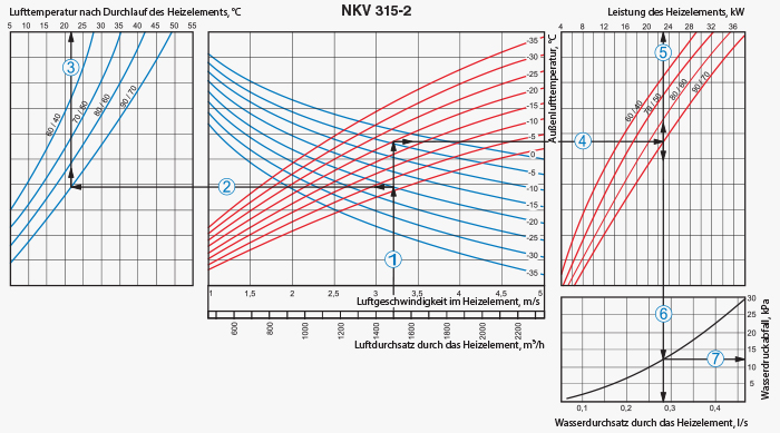 Das Heizregister ist mit der Gegenstromschaltung anzuschließen, im anderen Fall kommt es zur Minderung der Leistungsfähigkeit um 5-15 %. Sämtliche Berechnungsnomogramme, die im Katalog enthalten sind, gelten für diesen Anschluss.
