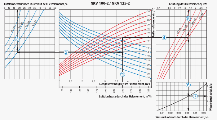 Das Heizregister ist mit der Gegenstromschaltung anzuschließen, im anderen Fall kommt es zur Minderung der Leistungsfähigkeit um 5-15 %. Sämtliche Berechnungsnomogramme, die im Katalog enthalten sind, gelten für diesen Anschluss.