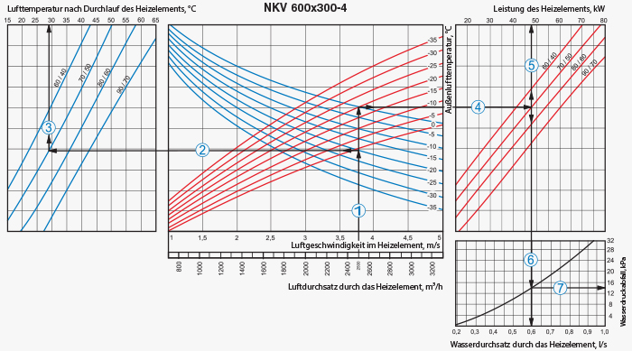Das Heizregister ist mit der Gegenstromschaltung anzuschließen, im anderen Fall kommt es zur Minderung der Leistungsfähigkeit um 5-15 %. Sämtliche Berechnungsnomogramme, die im Katalog enthalten sind, gelten für diesen Anschluss.
