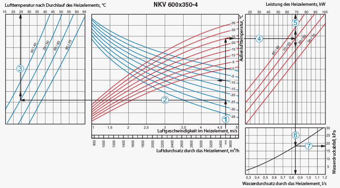 Das Heizregister ist mit der Gegenstromschaltung anzuschließen, im anderen Fall kommt es zur Minderung der Leistungsfähigkeit um 5-15 %. Sämtliche Berechnungsnomogramme, die im Katalog enthalten sind, gelten für diesen Anschluss.