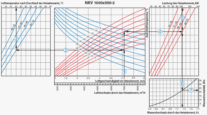 Das Heizregister ist mit der Gegenstromschaltung anzuschließen, im anderen Fall kommt es zur Minderung der Leistungsfähigkeit um 5-15 %. Sämtliche Berechnungsnomogramme, die im Katalog enthalten sind, gelten für diesen Anschluss.