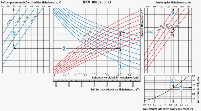 Das Heizregister ist mit der Gegenstromschaltung anzuschließen, im anderen Fall kommt es zur Minderung der Leistungsfähigkeit um 5-15 %. Sämtliche Berechnungsnomogramme, die im Katalog enthalten sind, gelten für diesen Anschluss.