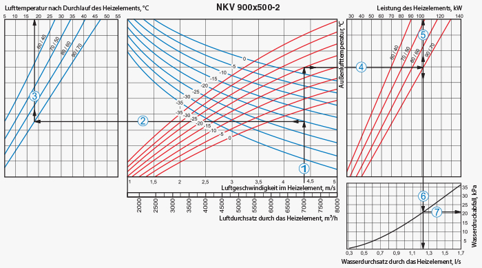 Das Heizregister ist mit der Gegenstromschaltung anzuschließen, im anderen Fall kommt es zur Minderung der Leistungsfähigkeit um 5-15 %. Sämtliche Berechnungsnomogramme, die im Katalog enthalten sind, gelten für diesen Anschluss.