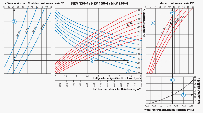 Das Heizregister ist mit der Gegenstromschaltung anzuschließen, im anderen Fall kommt es zur Minderung der Leistungsfähigkeit um 5-15 %. Sämtliche Berechnungsnomogramme, die im Katalog enthalten sind, gelten für diesen Anschluss.