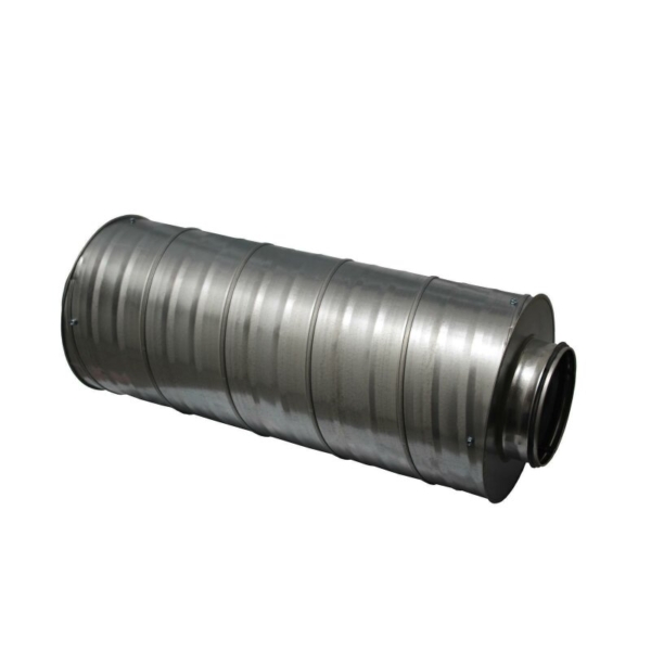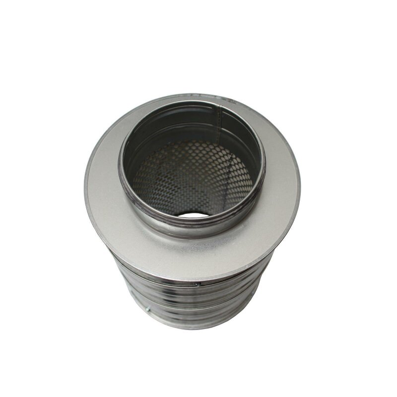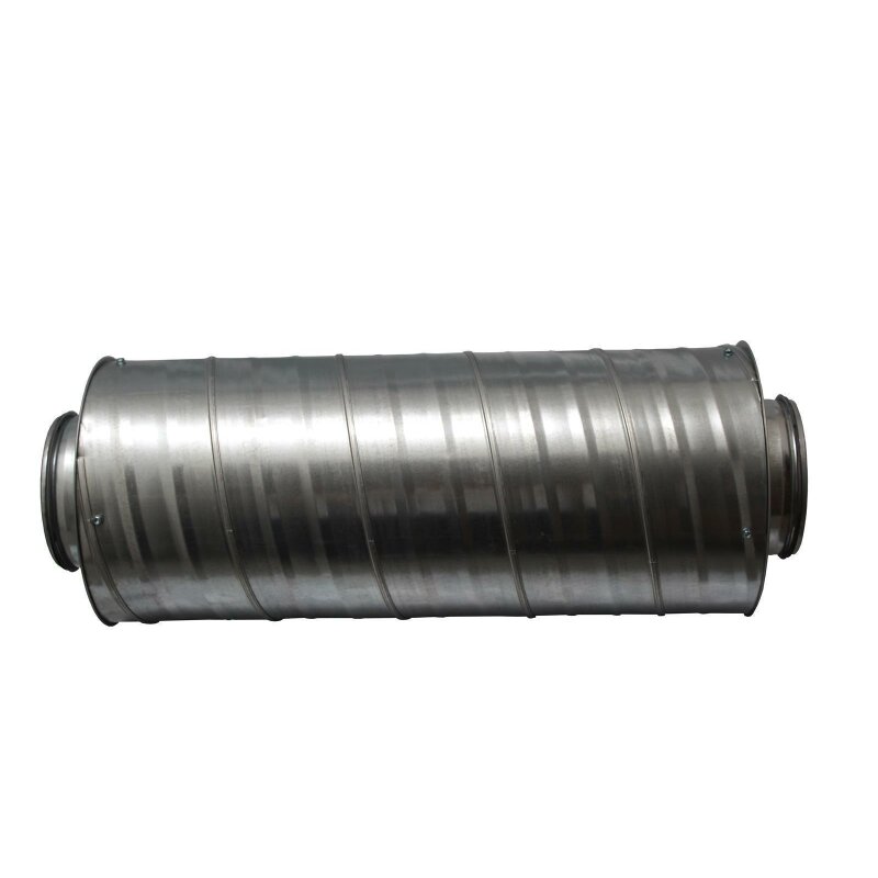 Rohrschalldämpfer aus verzinktem Stahlblech zur Geräuschreduzierung in runden Luftleitungen.